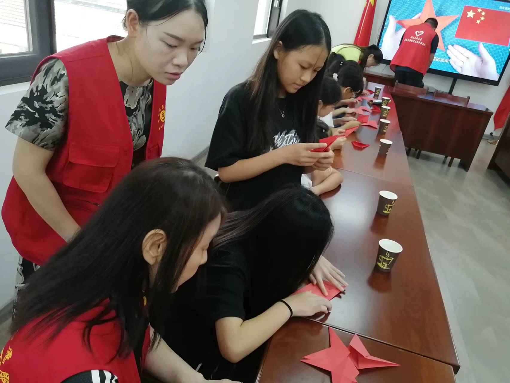 活动的最后,在志愿者们的指导下,大家一起动手进行手工折纸,一颗颗红色的五角星在大家的努力下顺利完成,同学们争相展示着自己制作的“红星”,满满的自豪感油然而生。