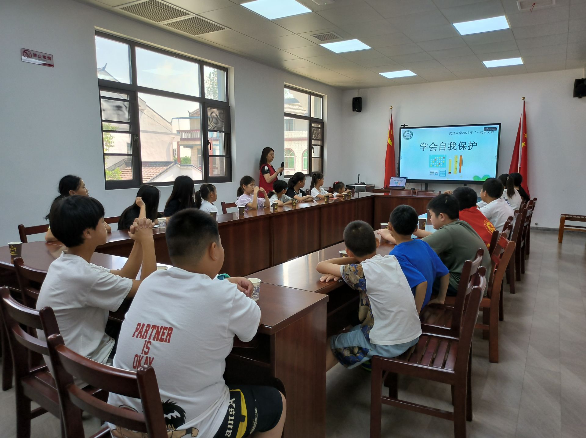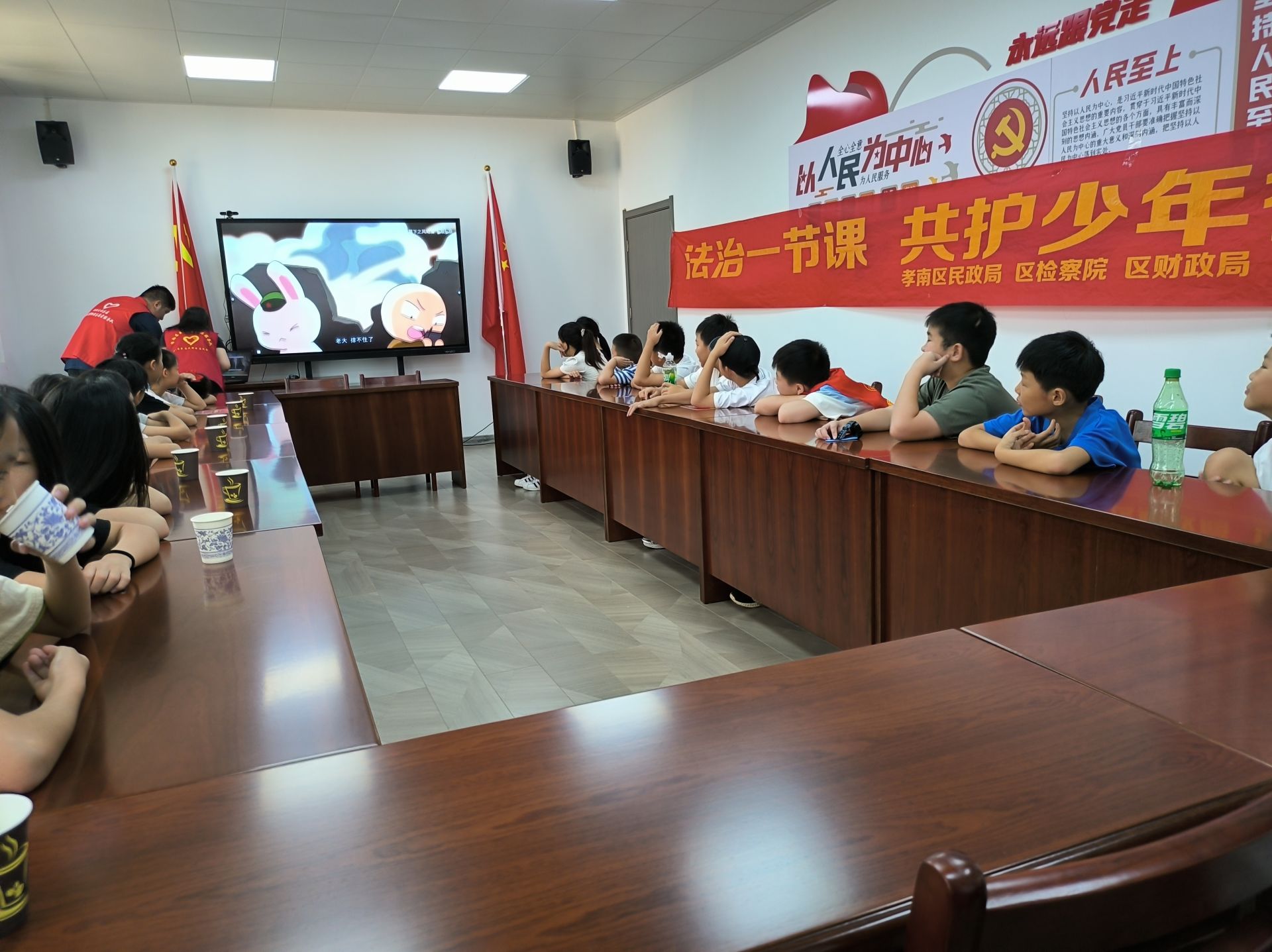 回到王新亭将军陈列馆活动室,学生们在志愿者的带领下观看红色教育视频《那年那兔那些事儿》,通过动画生动形象的向大家分享党史故事。随后,同学们与武汉大学志愿者开展“一起云支教”活动,大学生志愿者通过网络连线的方式,为学生们进行“学会自我保护”专题宣讲,结合学生的特点,用生动的事例,教育引导学生提高防范意识,学会自我保护。