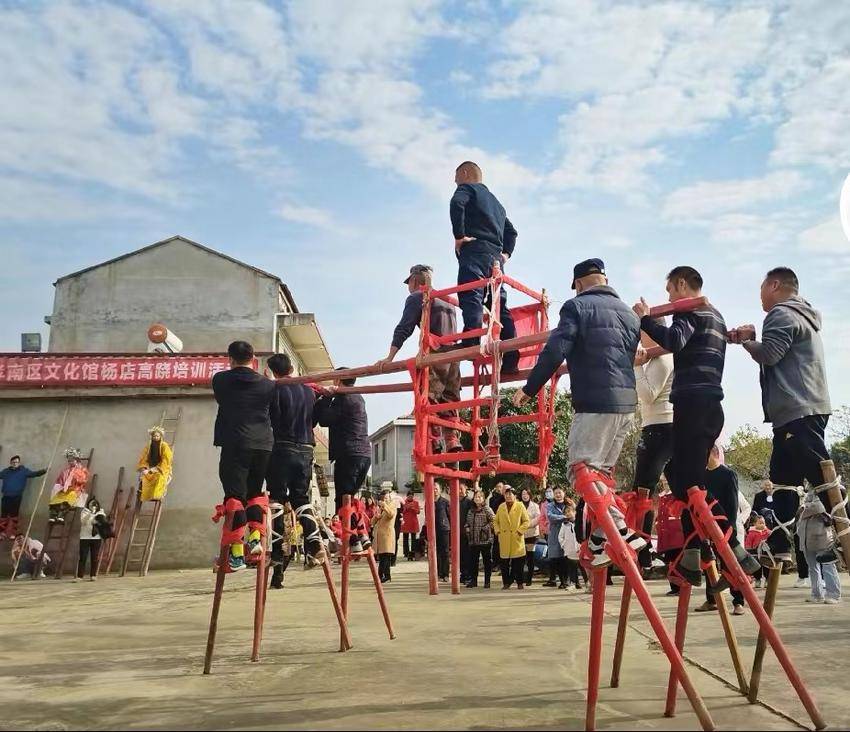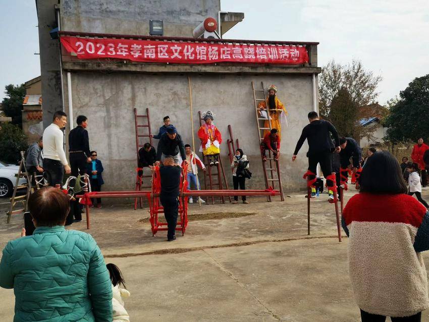 高跷在杨店延传历史悠久,种类繁多,不同村砦之间各有其特点。基本分为“文跷”“武跷”两类。杨店镇邱畈村的孙家大湾就是武高跷的杰出代表。