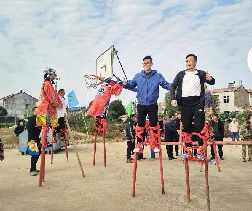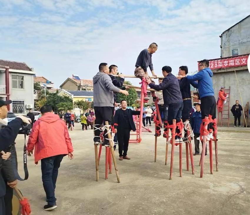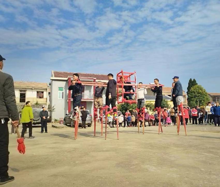 另外还有更加精彩的翻高跷表演,十几名壮汉踩着高跷抬着用竹子架起的竹轿子,里面站有一人,任轿子翻转人不掉下,轿中的人辗转腾挪,技法高超,博得众多掌声。