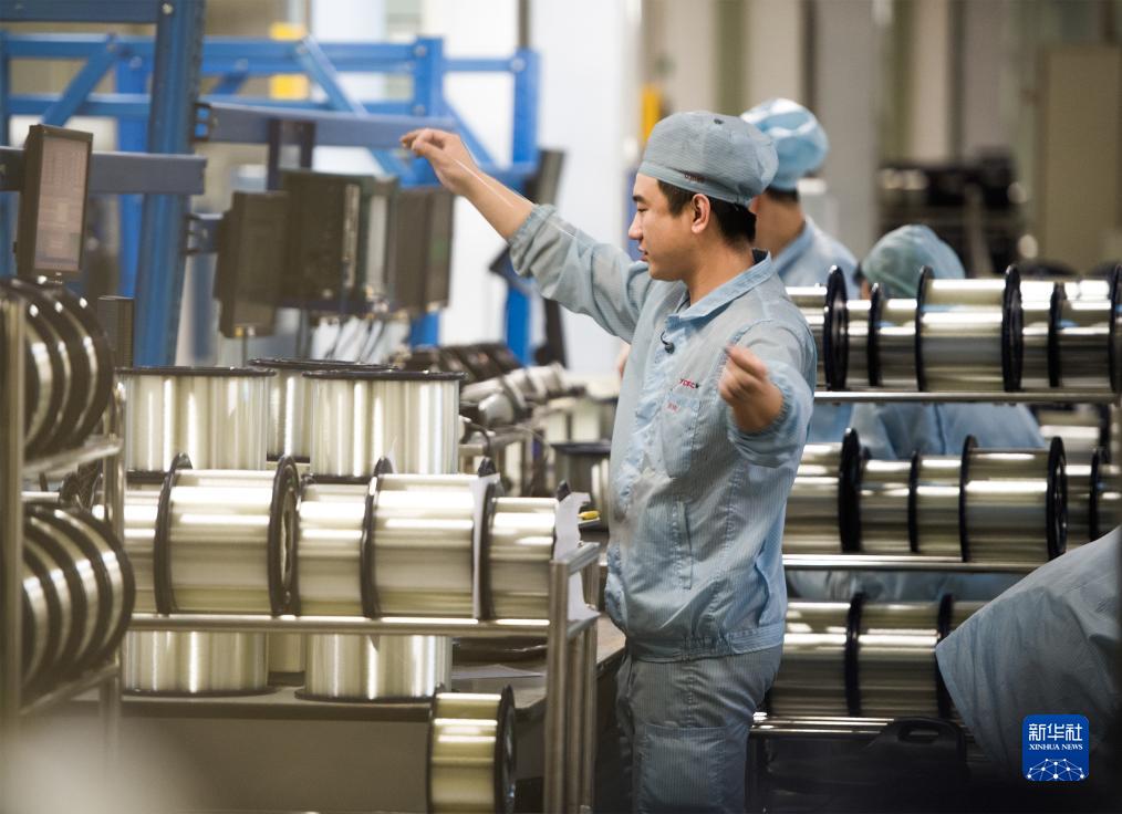 在位于武汉的长飞光纤光缆股份有限公司光纤生产车间内,工作人员对光纤进行检测(资料图片)。新华社记者 肖艺九 摄