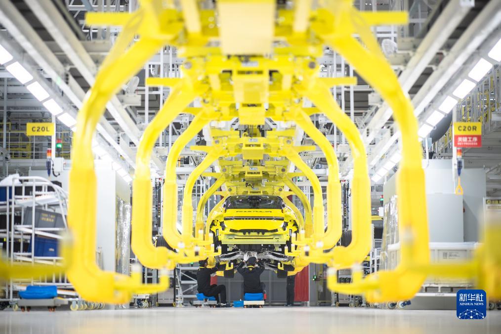 在位于武汉经开区智能网联和电动汽车产业园的路特斯全球智能工厂,工人在流水线上作业(2023年1月11日摄)。新华社记者 肖艺九 摄