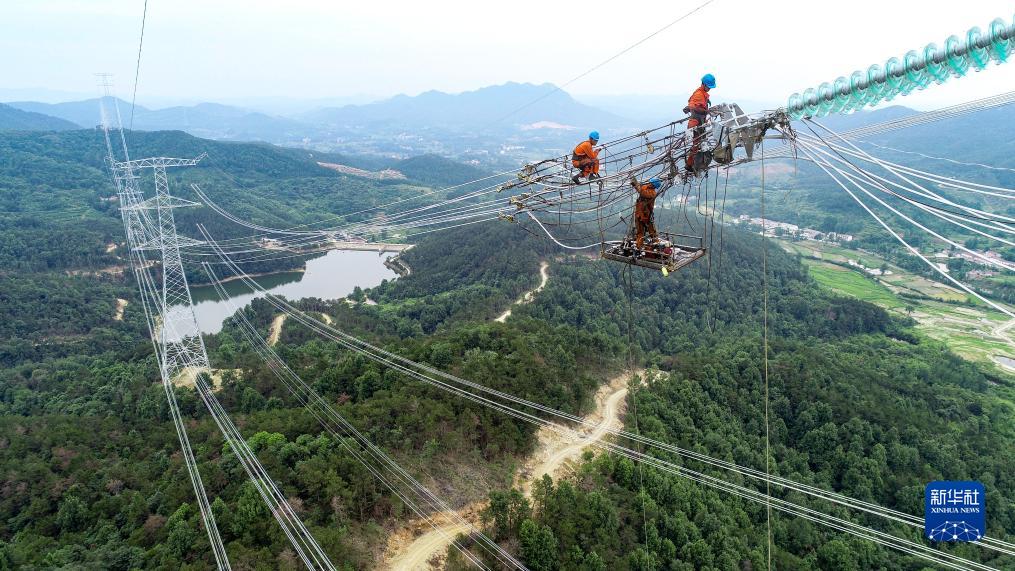 国网湖北送变电公司施工人员在湖北黄冈地区驻马店—武汉1000千伏特高压交流工程工地开展最后的附件安装作业(2023年6月16日摄,无人机照片)。新华社发(邹小民 摄)
