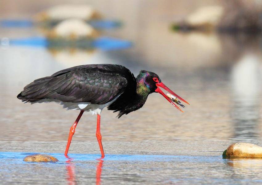 黑鹳(学名:Ciconia nigra)是一种体态优美,体色鲜明,活动敏捷,性情机警的大型涉禽。成鸟体长为1米-1.2米,体重2千克-3千克;嘴长而粗壮,头、颈、脚均甚长,嘴和脚红色。身上的羽毛除胸腹部为纯白色外,其余都是黑色,在不同角度的光线下,可以映出变幻多种颜色。在高树或岩石上筑大型的巢,飞时头颈伸直。