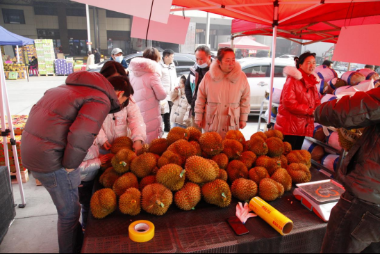 “进口榴莲便宜卖,26.5元一斤啦!”大门口处不时传来商家的叫卖声,原来是小宝哥档口员工正在热销进口的榴莲。“今天我们在会场准备了四十吨进口的榴莲,各种等级的榴莲都有,就目前状况来看,销量是不错的,后期我们会不断补货,来保证供应。”该公司负责人郝艳峰望着摊位前围满的人群,会心一笑。