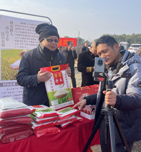 这次活动中最鲜艳的色彩当属“农业数字兵”。“农业数字兵”们组建“职业带货团”,身着红色的马甲,手持专业的拍摄设备,穿梭于年货市集中。他们一边拍摄现场情况,一边进行直播讲解带货。帮助周边的合作社、家庭农场和农户把自家的优质农产品销售出去是他们的初衷。