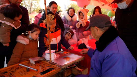 孝感米酒、孝南转糖人等美食色香味俱全,既是记忆中的味道,也是“舌尖上”的新年。孝感转糖人项目区级非遗代表性传承人张绍真根据群众需求绘制出龙、兔子、牛、羊、马等糖人,活灵活现,引得小朋友们拍手叫好。