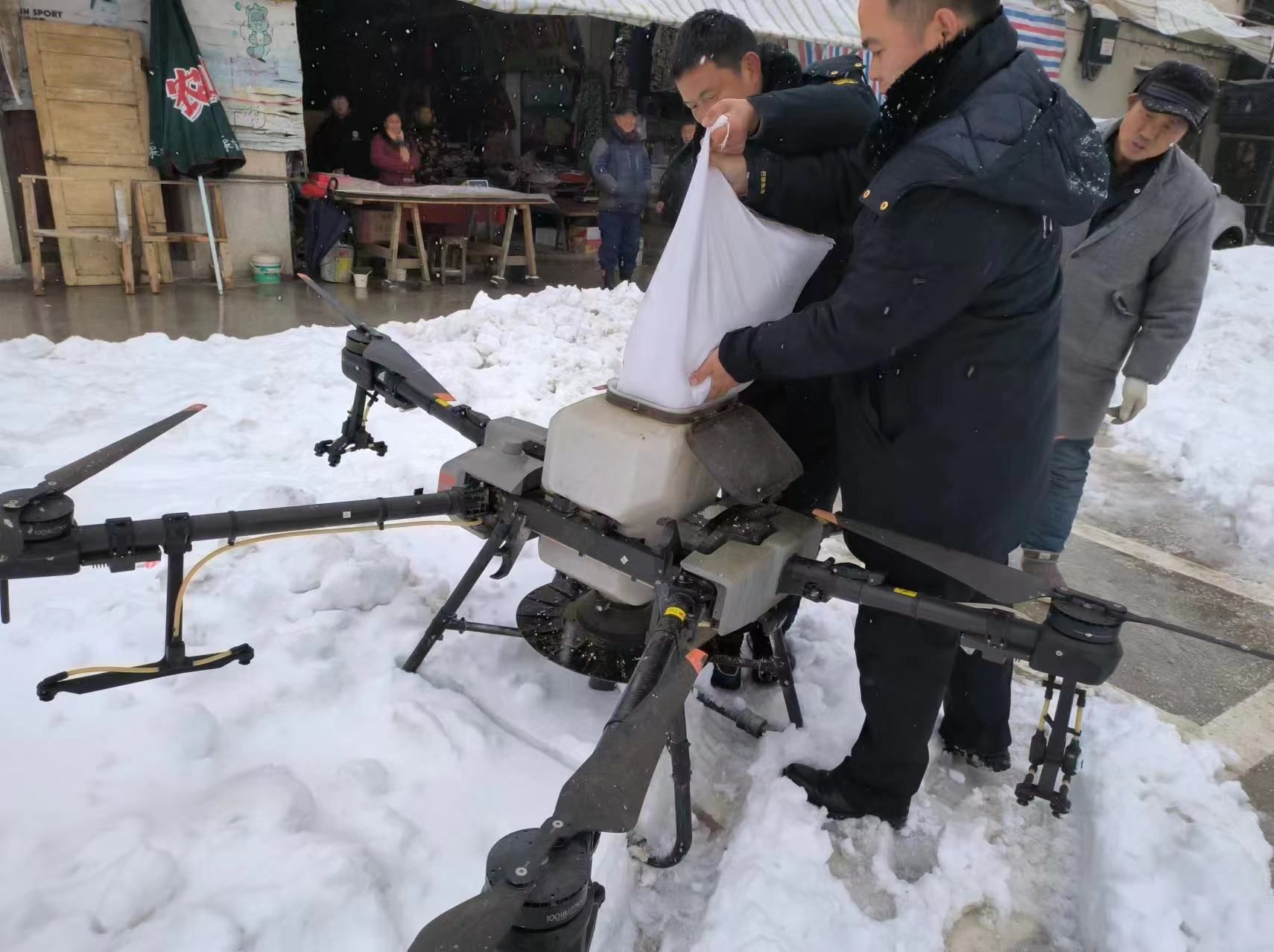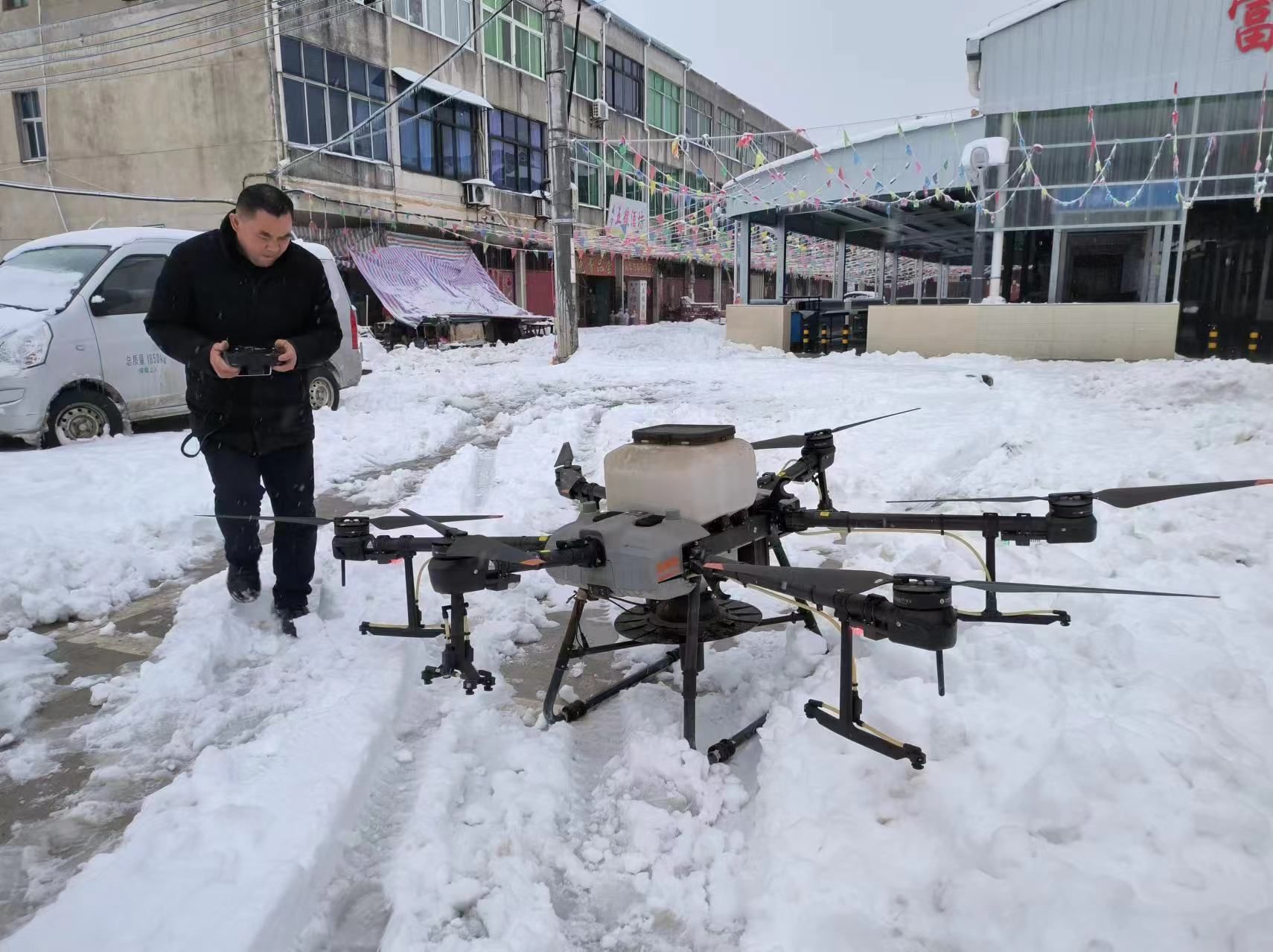 “听说集贸市场顶棚不方便除雪,需要使用无人机高空作业,我就带着机器赶来帮忙了。”孝感市天源润丰农业养殖合作社负责人杨旭峰说道。平时植保无人机都用来进行田间作物飞防作业,在暴雪天气和集贸市场特殊结构的影响下,为了防止积雪压塌顶棚,操作无人机抛撒融雪剂实施顶棚除雪作业,让除雪工作既轻松又高效。除雪剂像小雪块均匀撒在集贸市场顶棚上,不一会功夫,3000余平方米的集贸市场顶棚除雪剂抛撒工作就顺利完成。