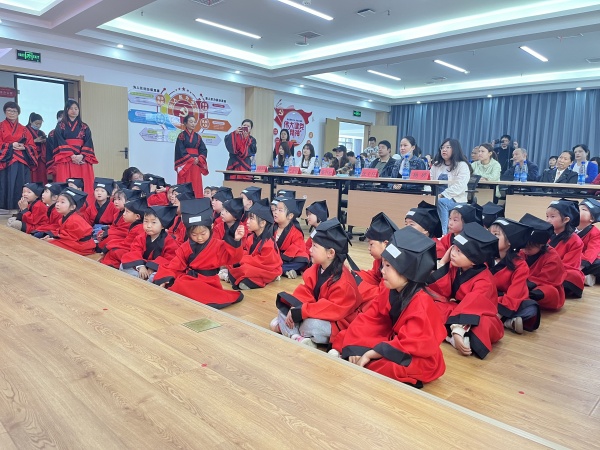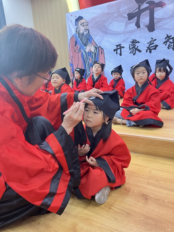 “朱砂开智”环节寓意着眉间一笔,朱砂丹心,目明耳聪,茅塞顿开。老师们为孩子们点朱砂,期望同学们从此心明眼亮,好读书,爱学习;读好书,正品行;读书好,有成就。