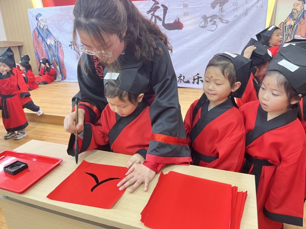 “开笔写字”环节中,一方砚台、一支毛笔,在老师们的带领下,孩子们在一撇一捺间感受“人”一字的分量,将一个顶天立地的“人”字深深印在纸上,堂堂正正做人的道理牢牢记在心间。