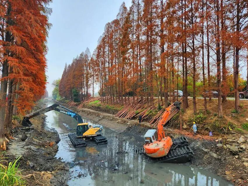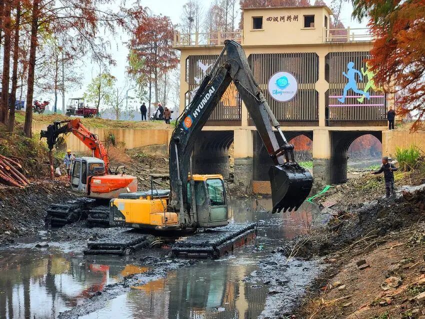 随着挖掘机的轰鸣声,渠道底部的淤泥、杂草等被清理出来,一条笔直规整的沟渠呈现在眼前。