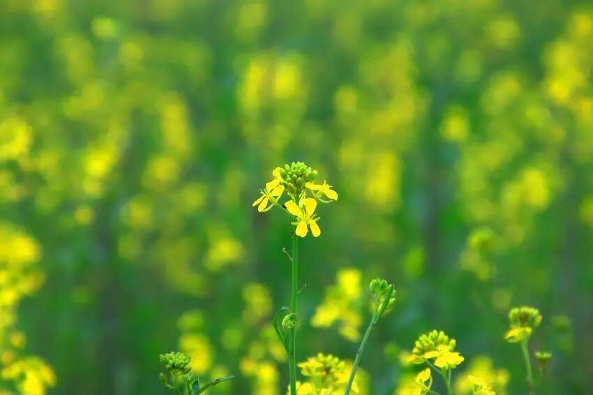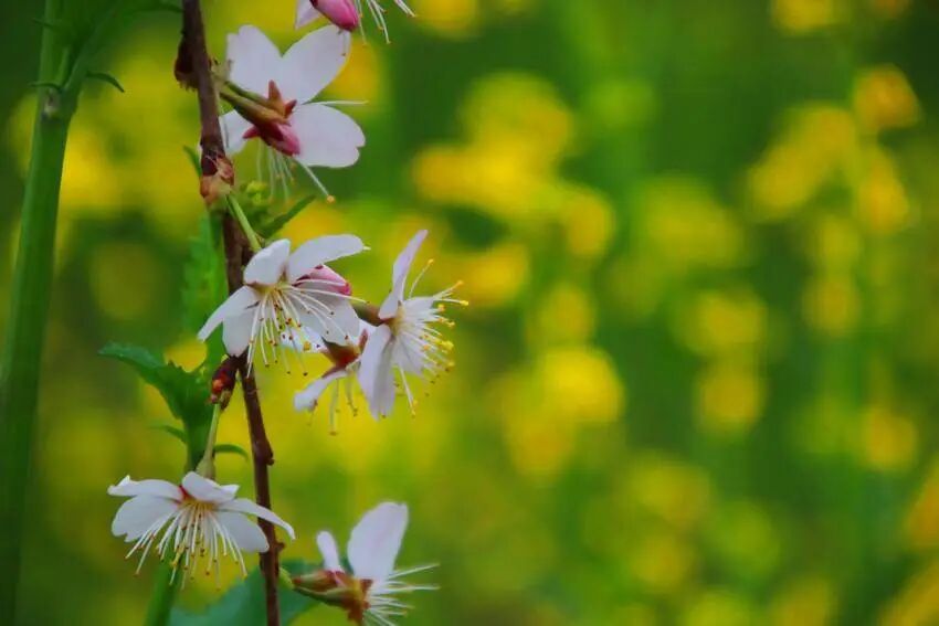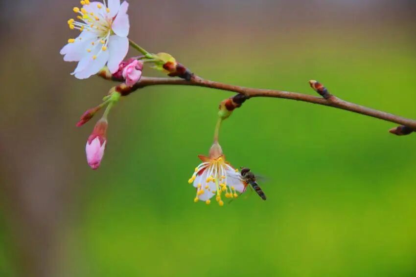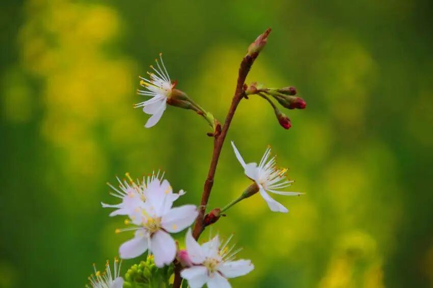 樱花丛中,蜜蜂穿梭、彩蝶振翅,清风徐徐,诗意氤氲。亭亭玉立于原野的樱花,与流金溢彩的油菜花田黄白交映,青绿互补,赏心悦目。