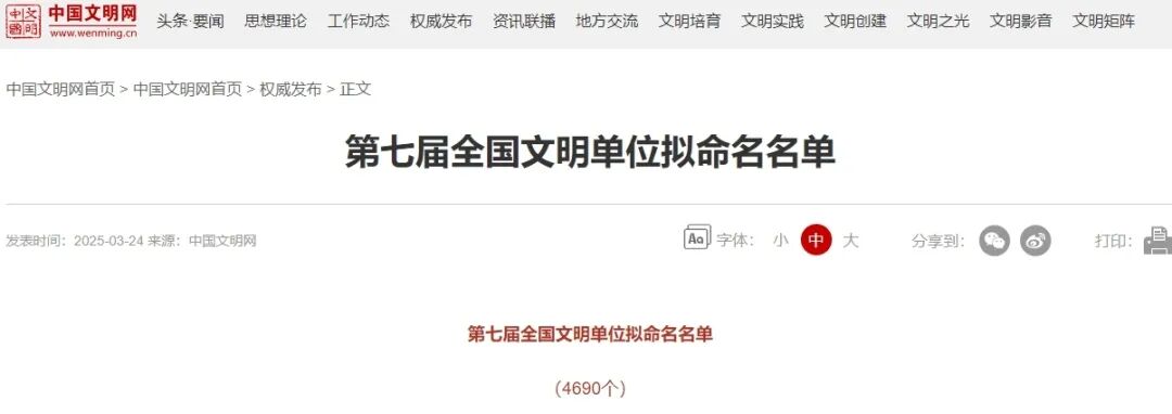 入选第七届全国文明单位拟命名名单