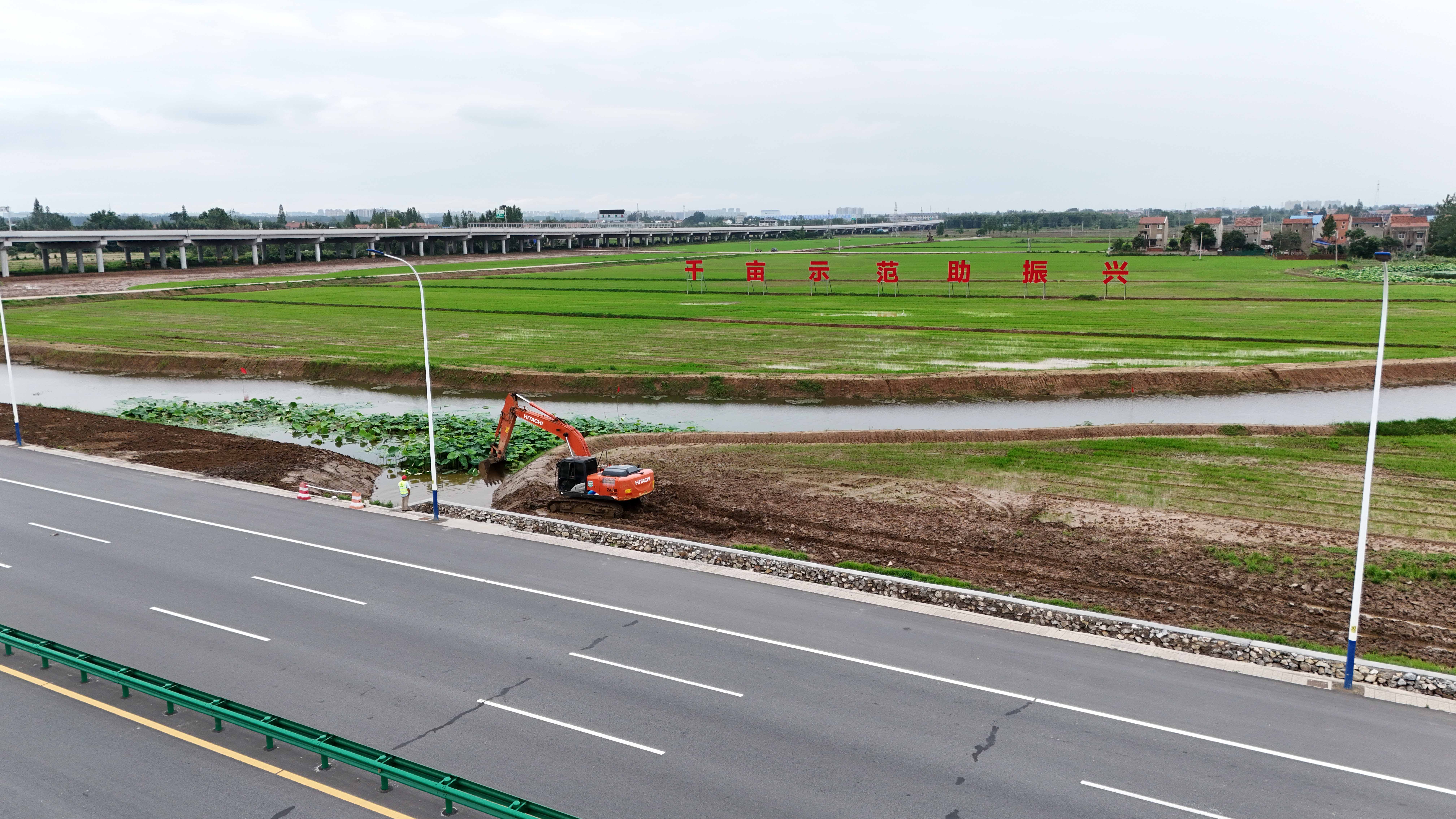 在朝阳村村委会门前,挖掘机挥舞着长臂,有条不紊地整治道路两侧环境卫生,为打造整洁美观的乡村风貌添砖加瓦。