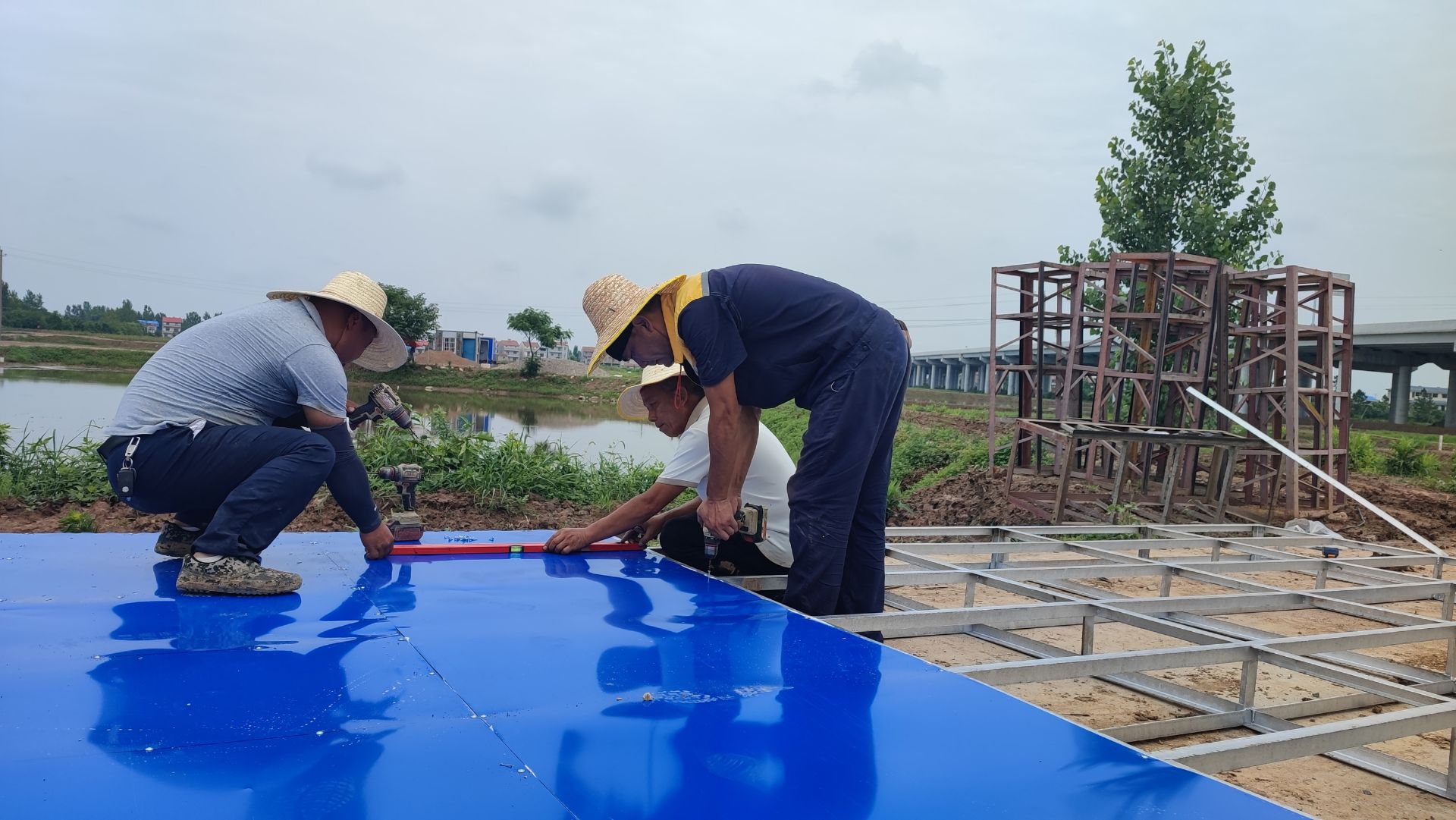 孝感长义生态农业科技有限公司所在地,展示牌安装工作正有序推进。据公司负责人介绍,近年来,陡岗镇积极外出招商,开展“楚商回乡”活动,他在得知麦草湖村有一处虾池待流转信息后,在村委会、镇商会、“四有人士”等帮助下,成功流转土地270余亩,用于种植优质水草种苗,进一步促进当地农业产业发展。