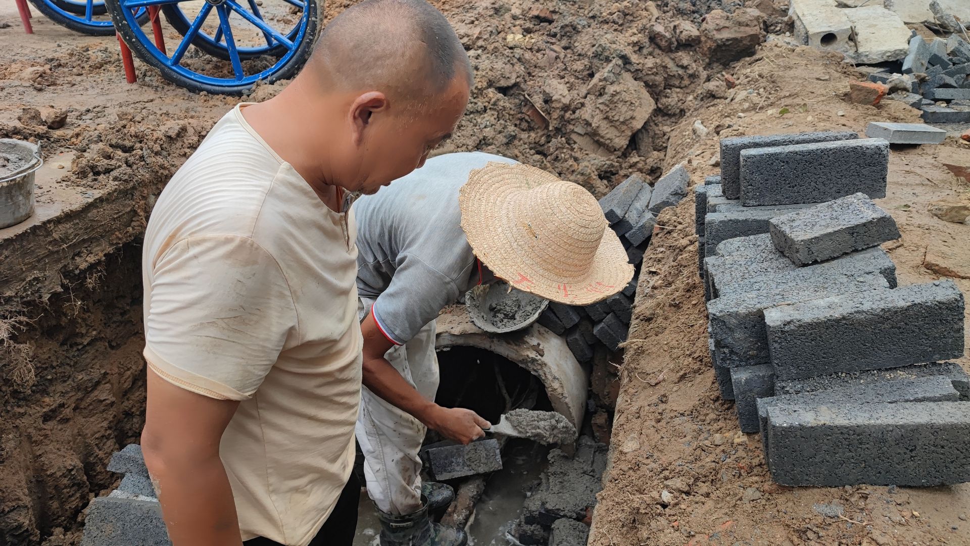 朝阳村朝阳店处,砌砖工人手法娴熟,污水管网施工也在如火如荼地进行,致力于改善农村人居环境,提升村民生活品质。