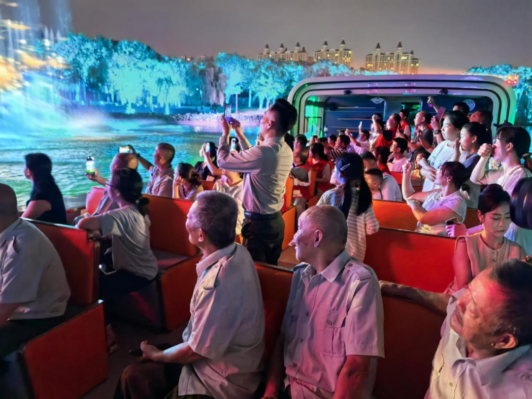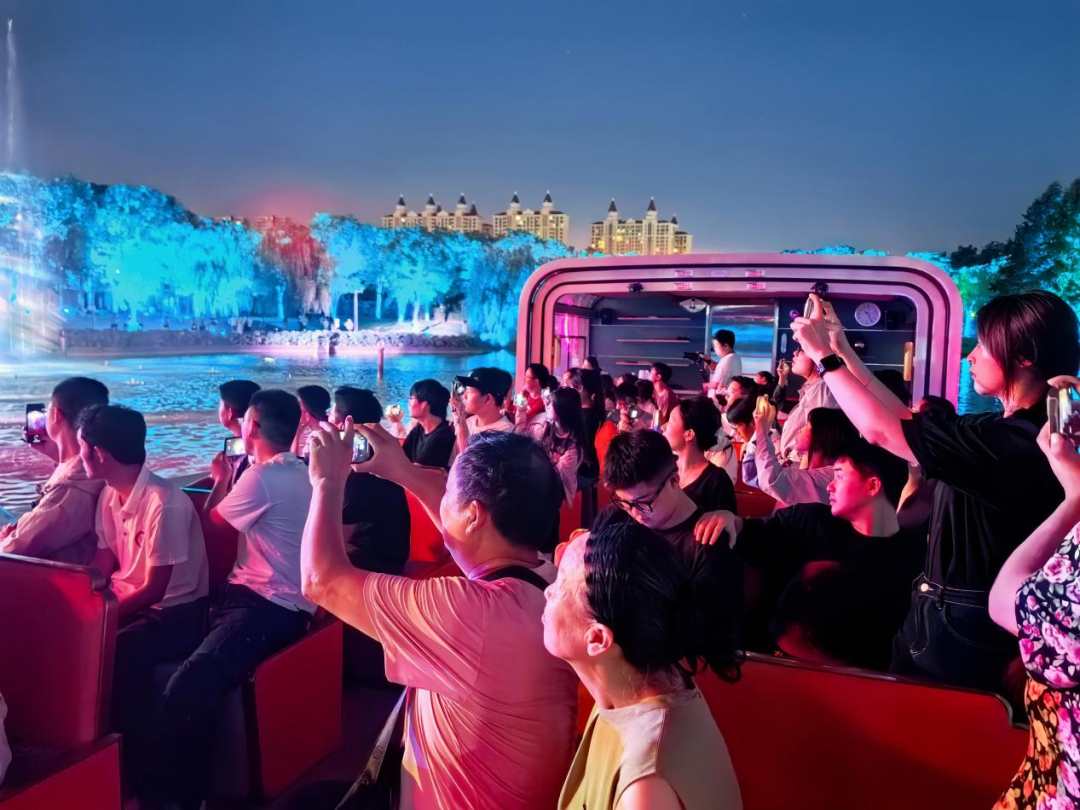“暑期运营一个月来,日均接待游客超600人次,周末更是一票难求。”项目负责人介绍,为满足需求,在原有夜游的基础上加开日游模式,推出“日间探秘航线”,游客可在白天近距离观赏槐荫河生态景观,聆听导游讲解沿岸的历史故事,“日游+夜游”的组合让游客玩得更尽兴。