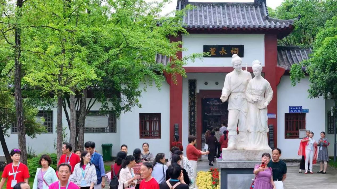 在董永公园内,这棵传奇古槐与仿古建筑群相映成趣,串联起瑶池仙境、鸳鸯楼台、董永祠等景点,形成一条完整的孝文化叙事链。树旁矗立的董永祠内,董永和七仙女携手挽臂的汉白玉雕像静立院中,祠内陈列着碑帖、族谱等历史文物,无声诉说着孝文化的千年传承。