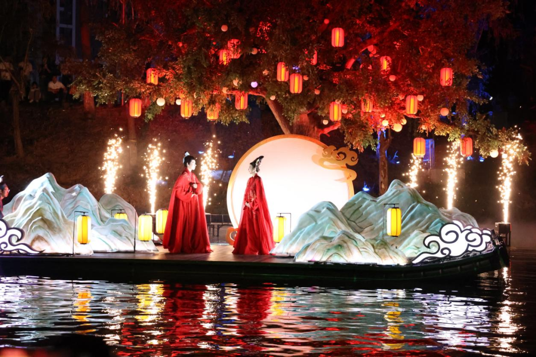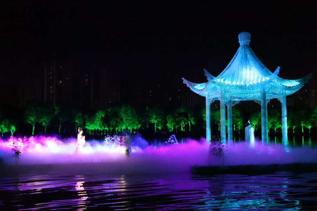每当夜幕降临,画舫游船载着游客缓缓驶入光影画卷。全息投影技术在河岸楼宇上再现董永与七仙女的爱情故事,岸边仿古建筑在灯光勾勒下尽显古韵,与实景演出交相辉映。