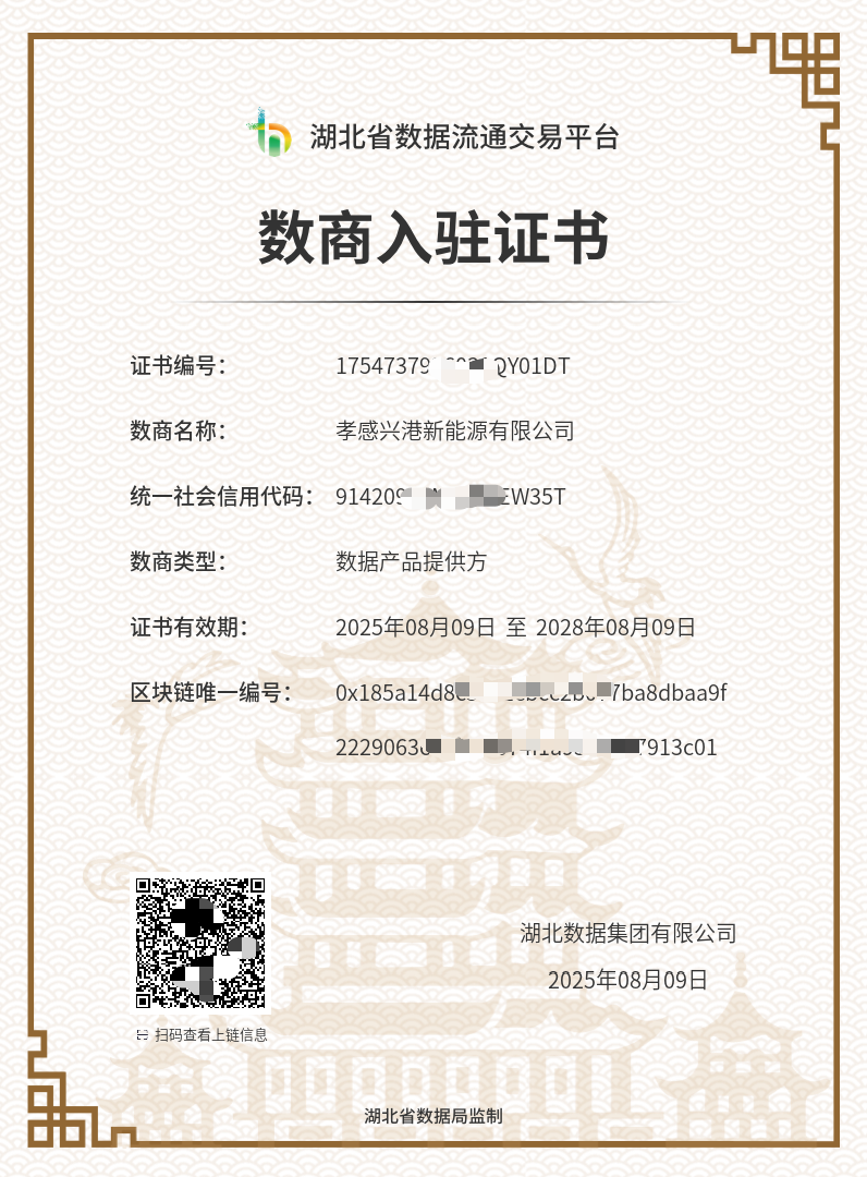 近日,在孝南区政务服务和大数据管理局指导下,湖北长兴国控资本运营集团有限公司(以下简称长兴国控集团)全资子公司——孝感兴港新能源有限公司(以下简称兴港公司)成功获颁由湖北数据集团有限公司签发的《数据产权登记证书》(证书编号:HB0020250917001)。这一喜讯不仅标志着孝南区首张数据资产“身份证”的诞生,更实现了全市范围内数据产权登记领域“零的突破”,为全市数据要素市场化改革树立了标杆。
