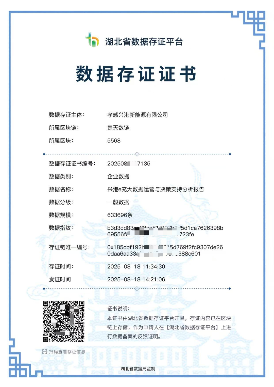 在孝南区政务服务和大数据局指导下,兴港公司顺利完成了一系列数据资产化流程:首先在湖北省数据流通交易平台完成“数商”认证,随后在湖北省数据存证平台通过区块链技术对数据完成存证,并最终成功获得产权登记。该证书明确了企业对相关数据具有持有权、经营权和使用权,其法律权属的确认为企业后续的数据资产交易、融资、入股等市场化运作扫清了障碍。