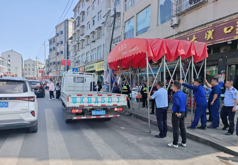 10月14日上午9时至下午1时,经过4个小时的集中行动,孝南区杨店镇主镇区主干道上最后一批违规设置的落地伸缩篷被依法拆除。