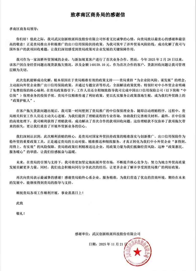 “多亏了孝南区商务局的精准帮扶,我们才能顺利化解海外回款风险,重拾拓展国际市场的信心!”。近日,落户孝南区的纸卫品企业创新欧派科技股份有限公司,向该局发来感谢信,字里行间满是对该局高效服务、担当作为的由衷赞誉。
