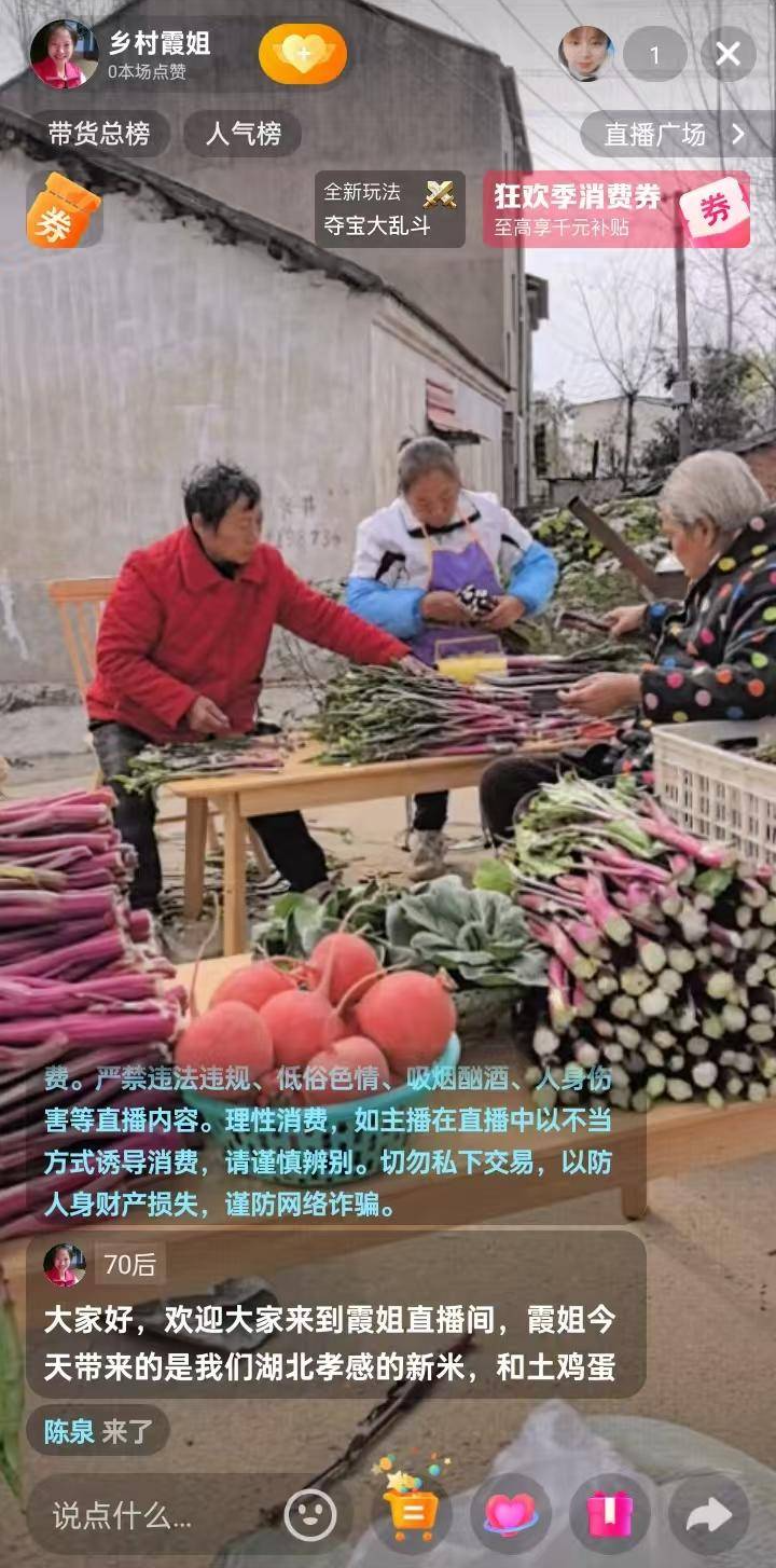 近日,孝南区肖港镇大联村村民张光辉的抖音直播间热闹非凡,镜头前摆满刚收割的红菜苔、白萝卜、青白菜,翠绿鲜嫩的蔬菜搭配他朴实接地气的推介,吸引了大批网友驻足下单。