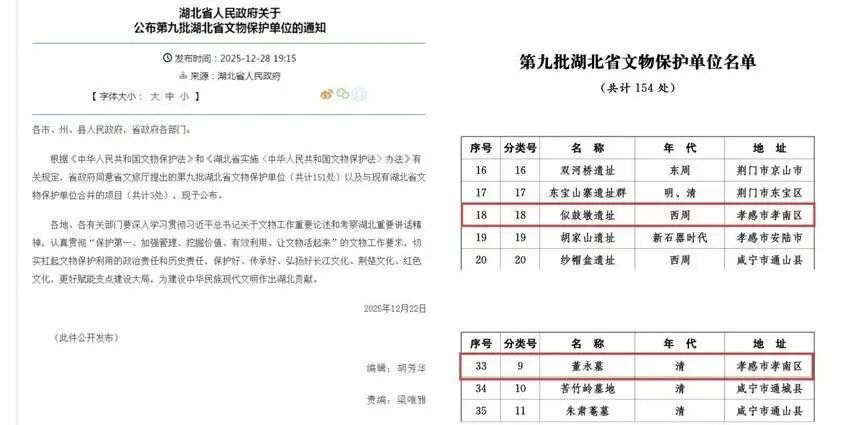 近日,第九批湖北省文物保护单位名单正式公布,孝南区“似鼓墩遗址”和“董永墓”,两处不可移动文物成功入选。