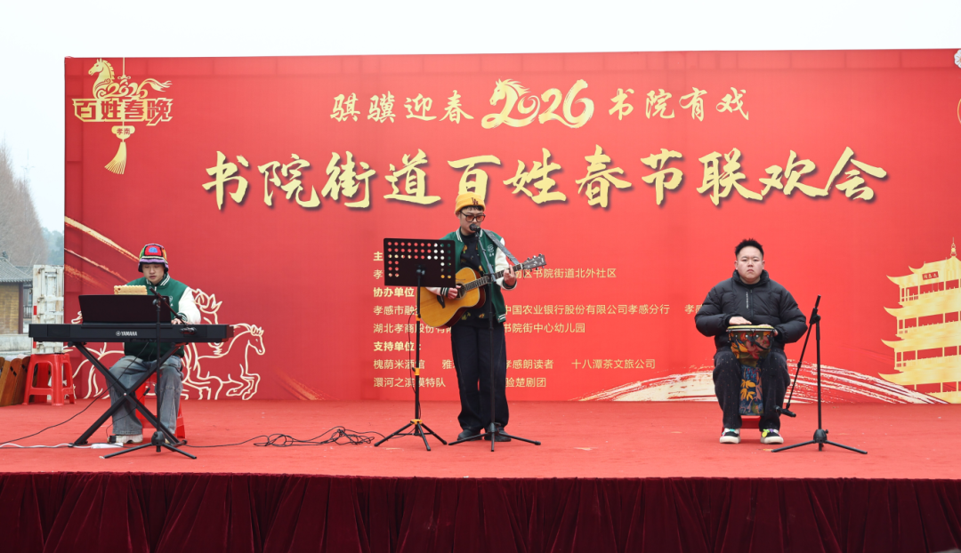 1月17日,孝南区书院街道后湖公园南大门,红灯笼随风摇曳,手写春联墨香四溢。居民微心愿墙上贴满了彩色纸条——“希望社区多组织邻里互助活动”“骐骥驰骋、势不可挡”……朴实的字句里,满是对新年的期盼。舞台上,市中心医院的刘爱林、王全医生“男扮女装”,表演穿越题材的小品,引得台下笑声阵阵;雅马哈河马乐队用一首励志歌曲,试图驱散冬日的寒意。健康义诊、政策讲解、米酒和腊八粥的香气、套圈游戏的欢闹,与自编自演的11个节目交织在一起。居民王阿姨笑着说:“这样的活动,让社区就像一个大家庭。”