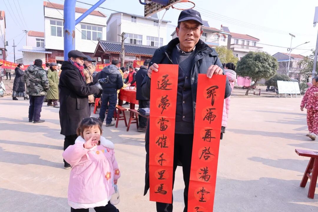 “活了大半辈子,还是头一回在家门口收到书法家亲手写的春联,这字看着就喜庆!”堰河村村民祝松寿手里捧着刚领到的3副春联和2张福字,脸上笑开了花。