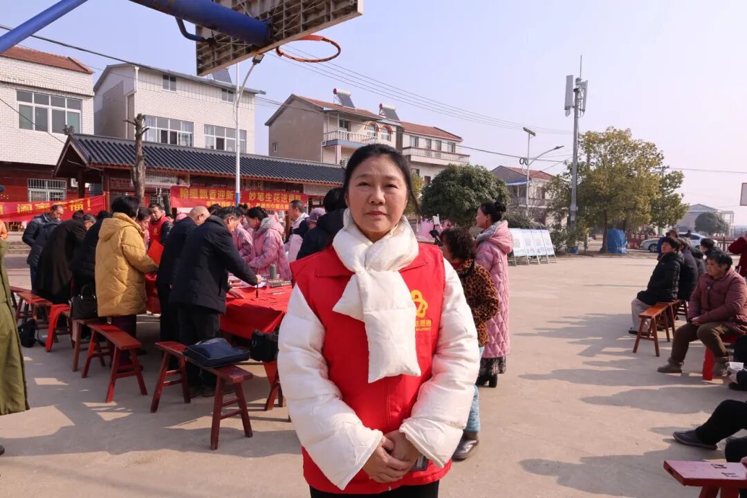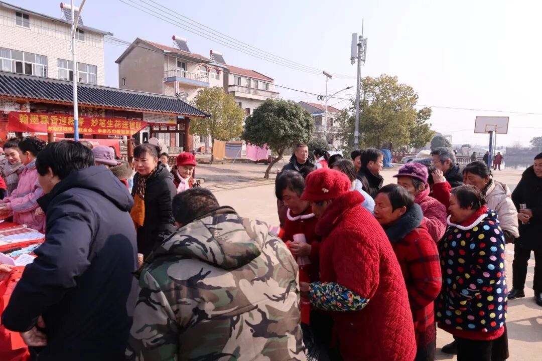 在忙碌的志愿服务队伍中,孝感市巾帼志愿者协会会长汤慧玲正带领志愿者们有条不紊地维持秩序、分发春联,并不时与村民们亲切交流。