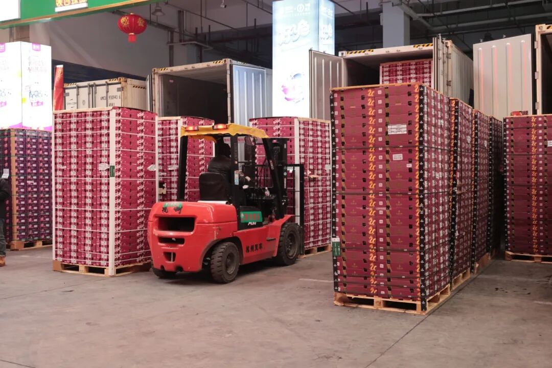 春节前夕,其高品质水果礼盒备货量预计将达到平时的3至5倍。目前,档口每日到货量稳定在5-10个货柜,日均销售约七成。