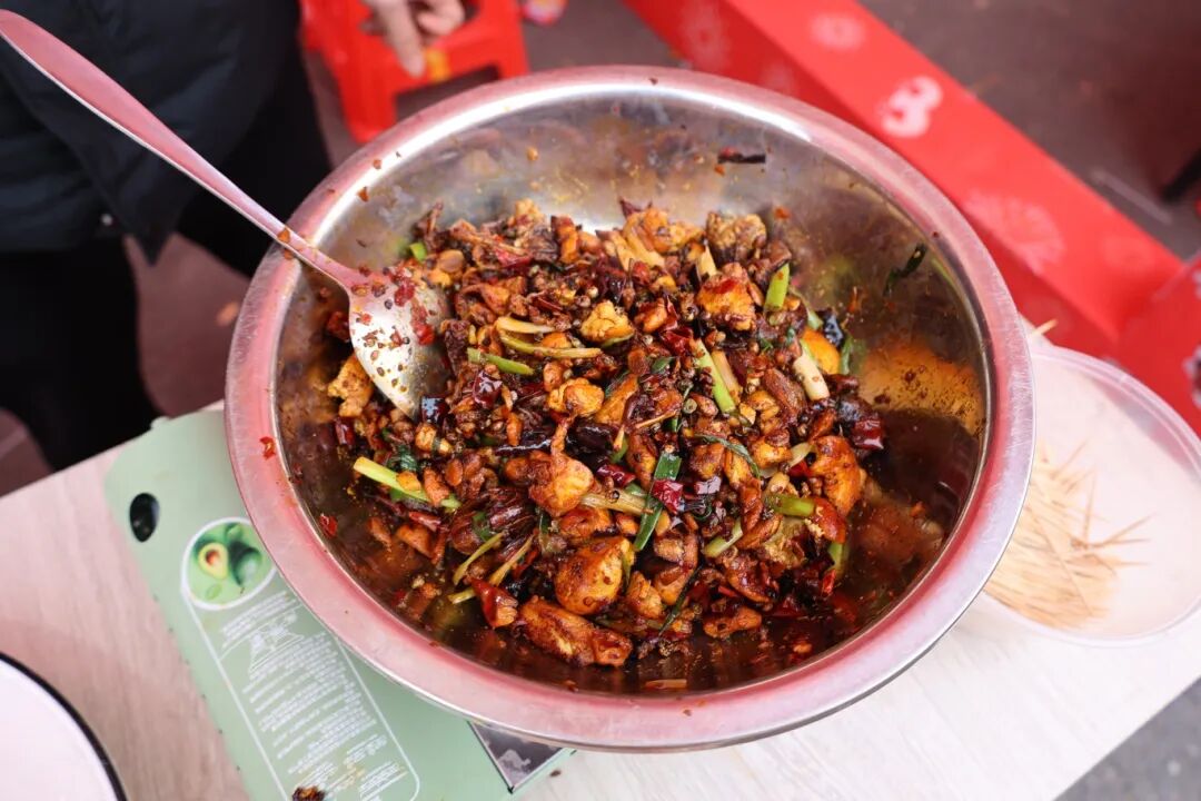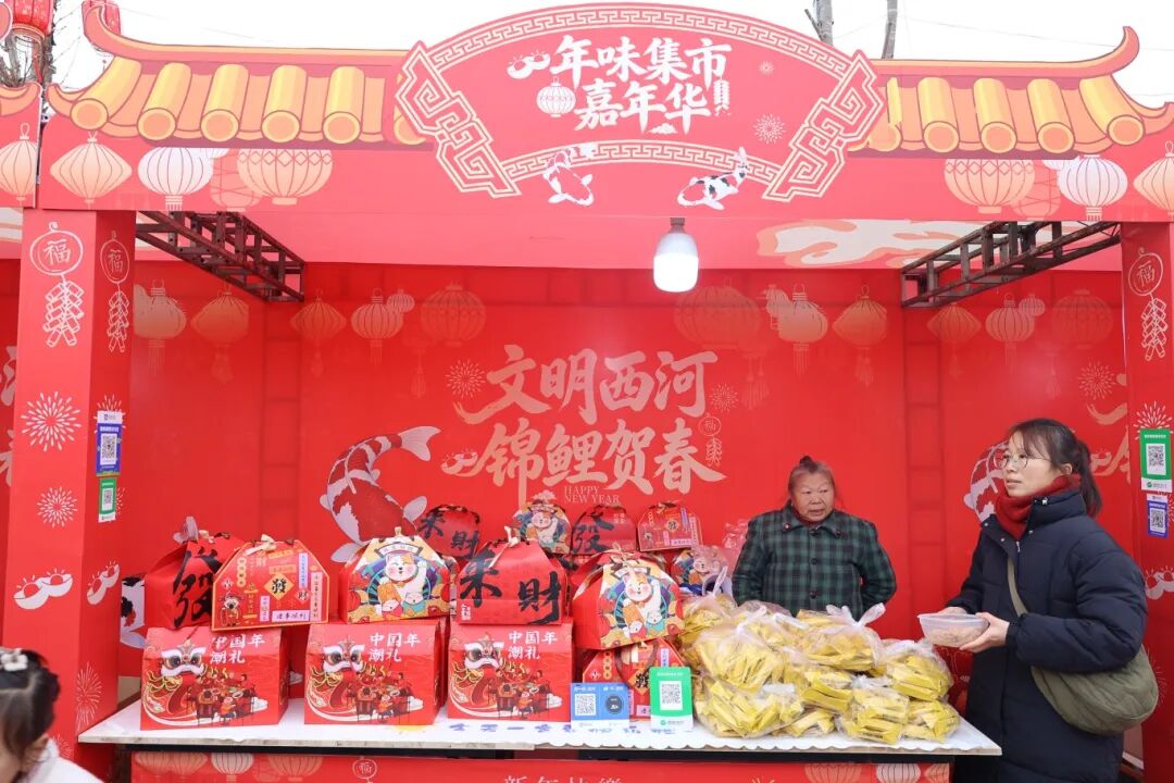 下午两点,中心广场上已是人潮涌动。张灯结彩的集市,点燃了人们“赶大集、办年货”的热情。小吃摊炊烟袅袅,香气四溢,其中西河本地特色“损鸡娃”引得食客纷纷驻足品尝。年货集市更是琳琅满目,水果、坚果、糖果及地道腊味产品摆满摊位,熟悉的年味扑面而来。