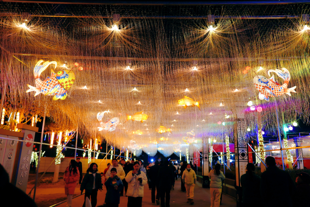 夜幕降临,一场精心设计的锦鲤灯光秀与晚会舞台交相辉映。广场树枝上的诗词彩灯如繁星闪烁,两条长长的灯光走廊悬挂着各式精美的锦鲤彩灯,在暖光中栩栩如生。无数彩色光带穿梭其间,宛若璀璨星河,将广场装扮成梦幻的流光世界,成为游客居民争相打卡留念的热门背景。