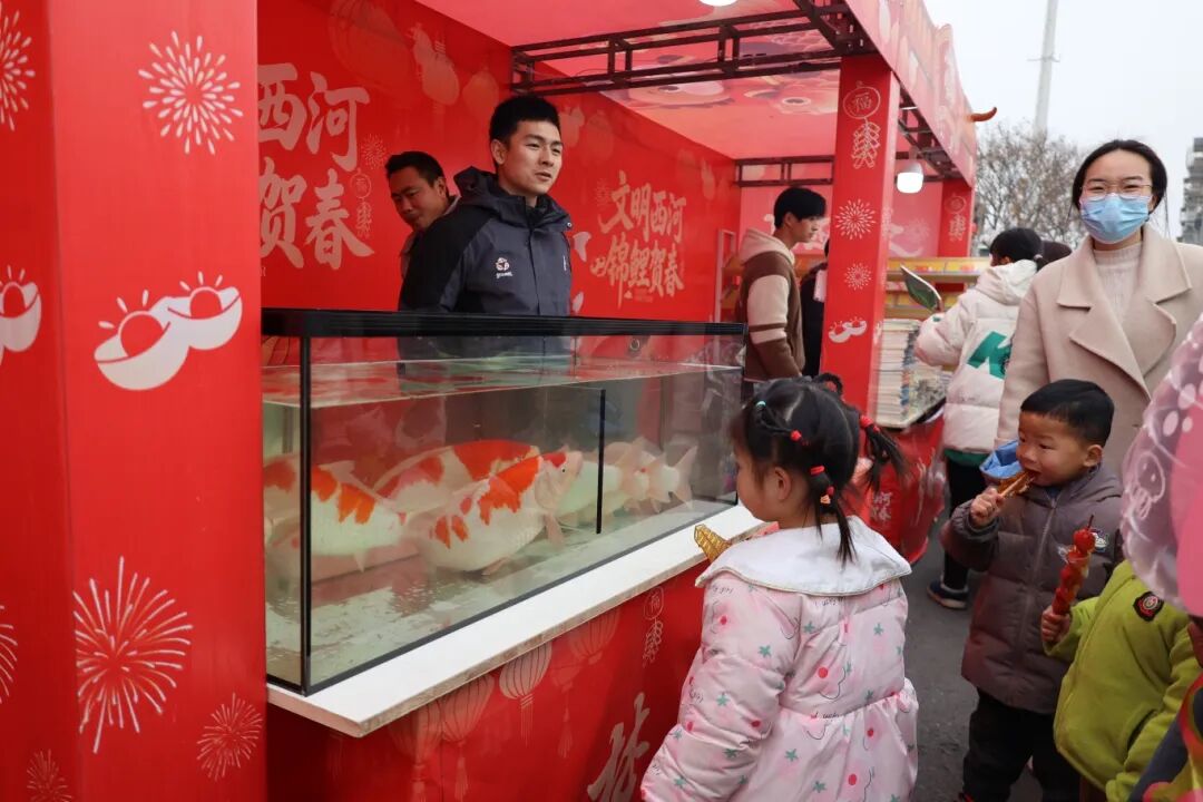 集市中,以“锦鲤”为主题的梦瑾锦鲤展示区尤为引人注目。展示缸中数尾精品锦鲤悠然游弋,与“梦瑾笔记本”等文创产品相映成趣,工作人员现场讲解锦鲤文化与产业规划,将“锦鲤送福”的美好寓意传递给每位参观者。整个市集用灵动的锦鲤造型装点,生动展示了西河镇打造锦鲤特色小镇的规划与成果。