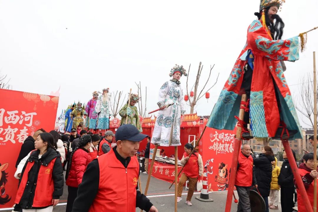 西河镇的年味少不了传统的非遗民俗展演——踩高跷。下午三点半,一阵激昂的锣鼓声划破喧嚣,一支高跷队伍隆重登场,表演者们脚踩高跷,身着彩装,随着鼓点稳健腾挪,演绎着流传百年的故事。所到之处人山人海,喝彩不断,乡土文化的生命力在铿锵韵律中尽情释放。