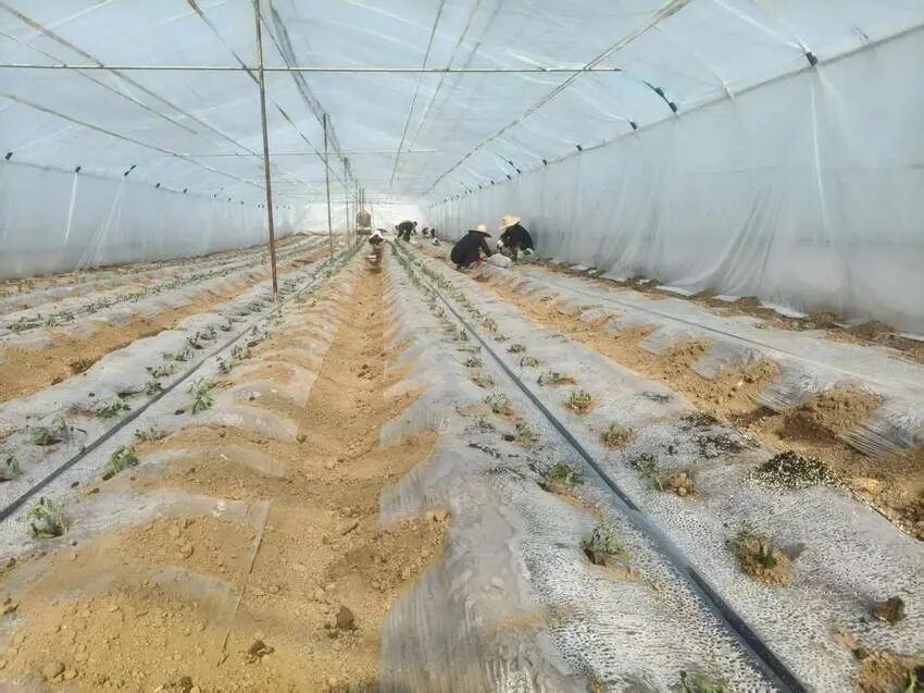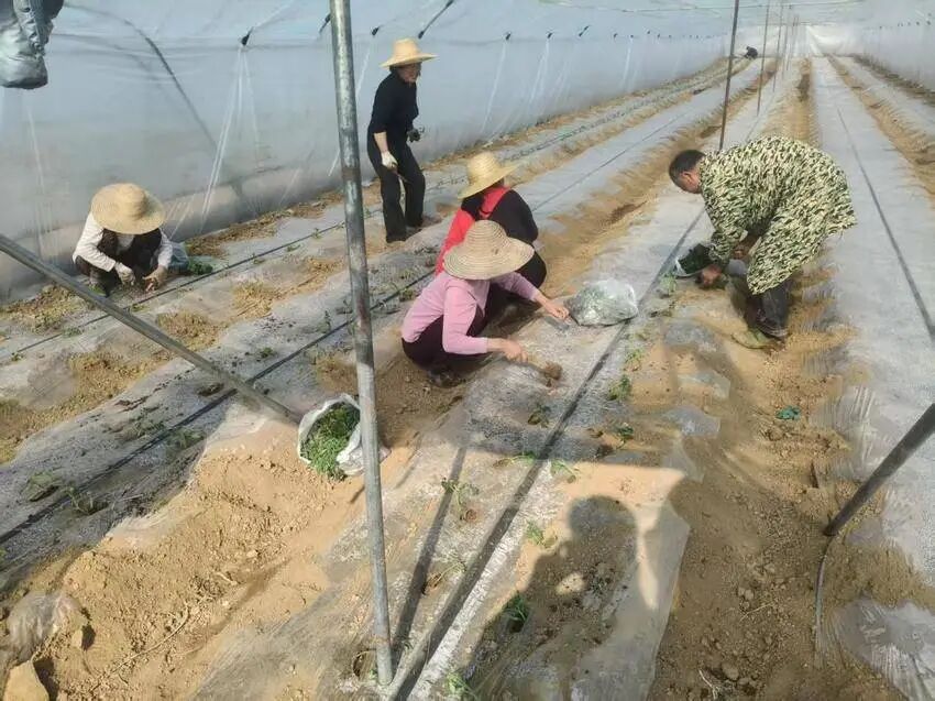 大棚里不仅有丰收的辣椒,番茄栽苗工作也在有序推进。工人们正有条不紊地进行着番茄栽苗工作,只见工人们保持着适当的株距和行距,熟练地进行着栽苗、扶苗、覆土、压实等工序,确保每一株番茄苗都能在良好的环境中扎根生长。