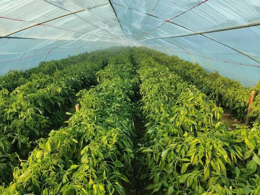 孝南区卧龙乡卫东村的田野上,温室大棚错落分布棚内绿意盎然,辣椒长势正好,呈现出丰收的繁忙景象。