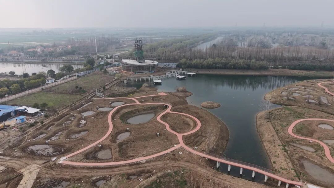已近尾声,蜿蜒的木质步道沿圩田延伸,部分路段已初具雏形。施工人员正在进行最后阶段的铺设与加固,预计3月下旬全面完成。